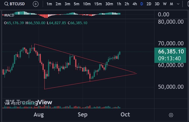 BTC triangle breakout. This one isn't as strong as if it were preceded by an uptrend, in which case the target would be 80k, but I won't be surprised to see it tag the all-time high at 74k-ish.