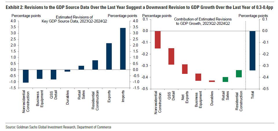 Based on revisions to key GDP source data, Goldman expects a downward revision of 0.3-0.4% to GDP growth over the last year, driven by downward revisions to nonresidential construction, services consumption, and equipment investment. Together, these revisions would lower year-over-year GDP growth through 2024 Q2 from 3.1% to 2.7%.