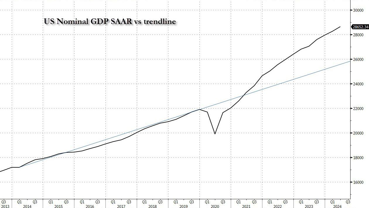 One of the saving graces of the Biden presidency is that while inflation and federal debt were soaring, the labor market and economic growth were both solid; in fact as shown in the chart below, nominal GDP was tracking about $2.5 trillion above the pre-covid trendline, an impressive achievement even if inflation accounted for the bulk of the divergence.
