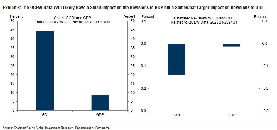 Separately, while last month's collapse in jobs was due to the revised Quarterly Census of Employment and Wages, Goldman does not expect the incorporation of QCEW data for the first quarter of 2024 to result in major revisions to GDP, both because the QCEW is used to estimate only a small share of GDP and because the 2023 QCEW data has mostly been incorporated into the current vintages of GDP (more details in the linked GS report available to pro subs). According to the bank, the inclusion of the QCEW could result in a further modest 0.1-0.2% downward revision to GDI, although the exact magnitude depends on how the BEA seasonally adjusts the data.
