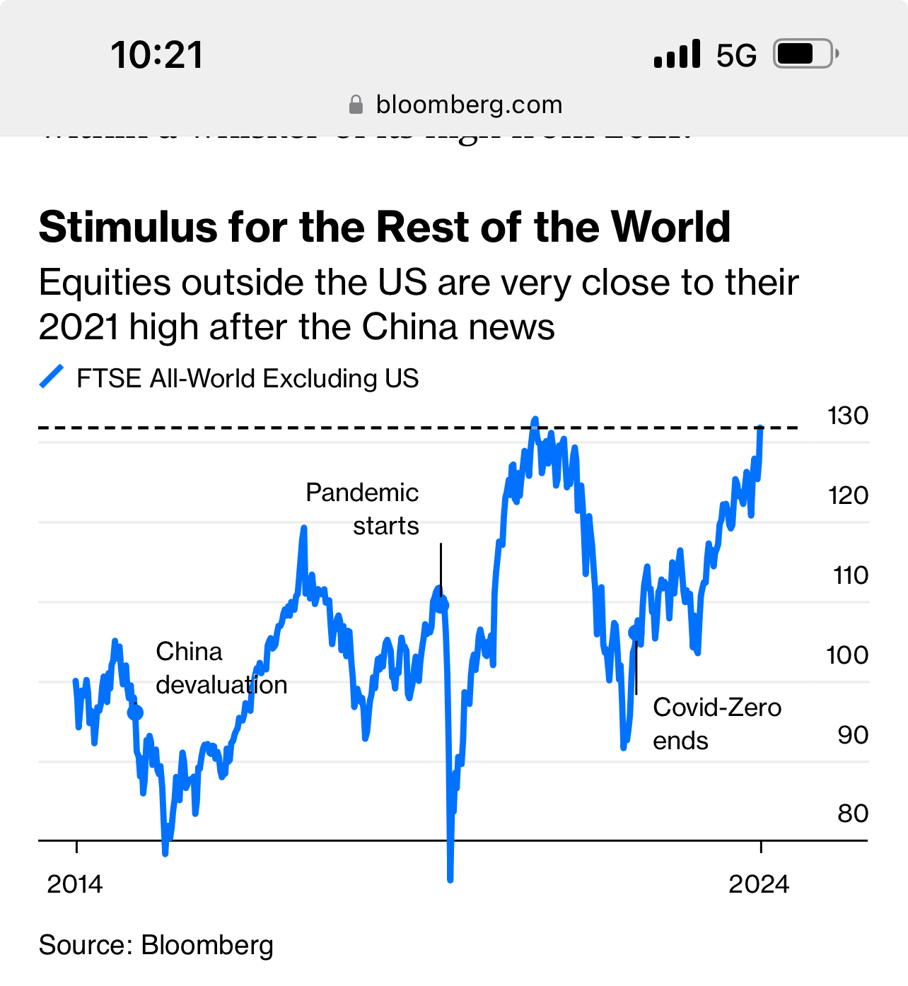 It’s also had a real impact on equities beyond China’s borders, helping in particular to spur excitement outside of America. FTSE’s index of all world markets excluding the US has rallied within a whisker of its high from 2021: