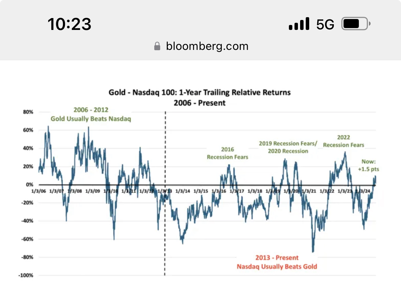 With the US economy humming along, it’s easy to understate harbingers of recessions. Is it possible gold is flashing warning signs? This DataTrek chart shows the Nasdaq 100 routinely outperforming gold over the last decade, often by 20 percentage points or more over any given one-year period. The exceptions came in 2016, 2019–2020, and 2022, when recession concerns were elevated or a contraction materialized: