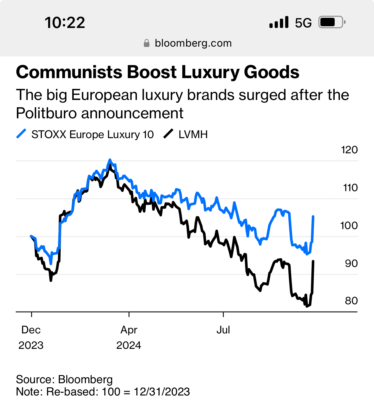 Today’s Points: • It looks like global investors really trust China’s Politburo. • The jury is still out on whether this is a true Mario Draghi Moment. • Luxury goods are the biggest beneficiaries of communist largesse so far. • Gold keeps setting new records, despite confidence in a soft landing. • AND: Jazz musicians like stardust even more than the rest of us.