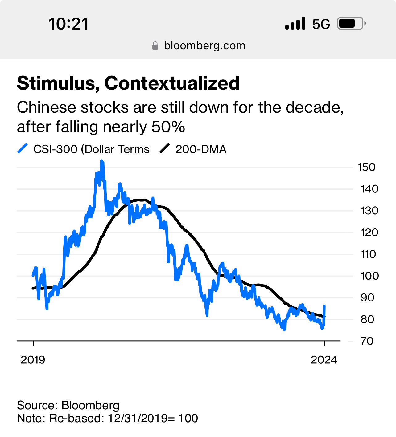 Suddenly, a lot of people are placing a lot of trust in the Communist Party of China. On Thursday, the Politburo, headed by President Xi Jinping, held an unscheduled meeting and then made an announcement that effectively amplified the monetary policy stimulus announced by the central bank earlier this week. On markets, at least, the leadership’s intervention had a big impact, and it got bigger the closer you were to China. The CSI-300, an index of the biggest mainland A-shares traded in Shanghai and Shenzhen, has rallied by more than 10% this week, and it’s nearly back to its high for the year: