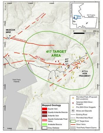 Figure 1 – Map of the 417 Vein Target Area showing outcropping veins and permitted drill pad locations.