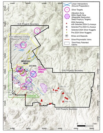 Figure 3 – Map of the Phoenix Silver property, showing main veins and targets. Much of the north half of the property is covered by Tertiary and Quaternary gravel and alluvium and has not been mapped in detail. Target # 1 (or 417 Target Area) encompasses the 417 lb silver fragment, multiple veins (see figure 1) and the permitted area for drilling. Targets south of the 417 area, include polymetallic veins as well as alteration zones potentially associated with porphyry-style mineralization.