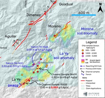 Figure 1. The La Ye vein system plan view shows drill hole DH402 and trenches reported in this release (Table 1), drilling and channel samples previously reported (Table 2). (CNW Group/Outcrop Silver & Gold Corporation)