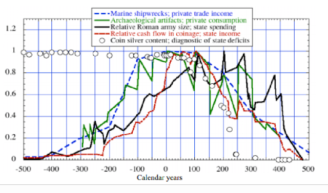 So, what was the straw that generated the economic collapse of the Empire? The most likely culprit is the debasing of the Roman denarius. As you can note in the figure by McConnell, above (look at the red dots), the content of silver in the denarius coin collapsed along the same trajectory followed by lead.