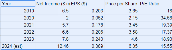 This 2024 annualized EPS amount of $0.39/share at $6.00/share = 15.38x PE The Lowest Ever!