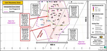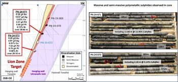 Figure 1: Longitudinal view of the Lion Zone Discovery; assay results from PN-24-071 and PN-24-073 are presented in red. The current size the of the zone is derived from observation of semi-massive to massive sulphides. An interpreted deformation corridor appears to control the presence and thickness of mineralized sulphides. (CNW Group/Power Nickel Inc.)