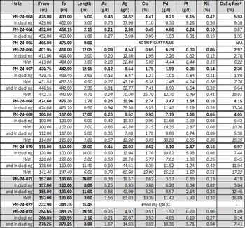 Note: Length is presented as downhole distance, as gathered from preliminary "quick logs"; true width corresponds to 60-80% of such downhole distance in function of the orientation of the hole. *CuEq Rec represents CuEq calculated based on the following metal prices (USD) : 2,360.15 $/oz Au, 27.98 $/oz Ag, 1,215.00 $/oz Pd, 1000.00 $/oz Pt, 4.00 $/lb Cu, 10.00 $/lb Ni and 22.50 $/lb Co., and a recovery grade of 80% for all commodities, consistent with comparable peers.
