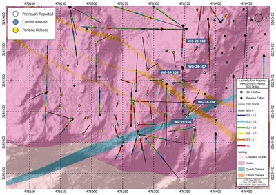 - Hole WG-24-108, intersected 1.04% Ni and 0.50% Cu over 10.0 metres from 68.0 to 78.0 metres.