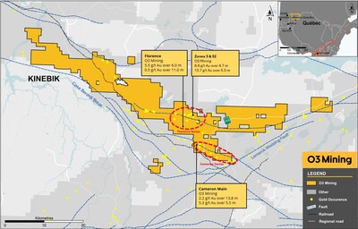 TORONTO, Nov. 20, 2024 /PRNewswire/ - O3 Mining Inc. (TSXV: OIII) (OTCQX: OIIIF) ("O3 Mining" or the "Corporation") is pleased to announce the start of an 8,000-metre drill campaign at the Cameron and Florence sectors of the Kinebik Project, which straddles over 55 km of strike along the prolific auriferous Casa Berardi trend. The Corporation mobilized two drill rigs to initiate the drill campaign.
