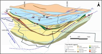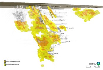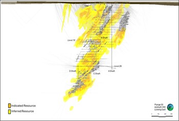 The updated resource is comprised of 66 modelled vein shapes. The geological interpretation of each vein incorporated the host lithologies, mineralization character, alteration style and structural features. The modelling was completed on cross-sections and level plans using drill hole data and detailed geology level maps drawn when the mine was in production. The level maps were also used to validate the vein traces and drill hole collar locations. The majority of the vein solids strike NW-SE or NE-SW (Figure 1) and plunge approximately 50 degrees to the NE or NW respectively. The mineralized gold trends tend to occur within shear zones and are hosted within favourable competent host rocks (gabbro, basalts and fragmental volcaniclastics). Three-dimension ("3D") modelling of the vein solids was generated in "Leapfrog Geo", a modelling software.