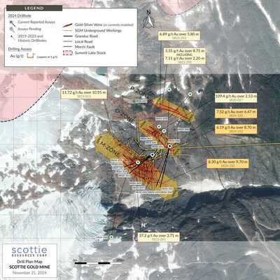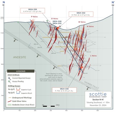 SCOTTIE RESOURCES INTERCEPTS 8.30 G/T GOLD OVER 9.70 M AND 6.19 G/T OVER 8.70 M AT SCOTTIE GOLD MINE N ZONE prnewswire.com News provided by Scottie Resources Corp. Nov 21, 2024, 07:30 ET VANCOUVER, BC, Nov. 21, 2024 /PRNewswire/ - Scottie Resources Corp. ("Scottie" or the "Company") (TSXV: SCOT) (OTCQB: SCTSF) (FSE: SR8) is pleased to report new assays from its 2024 drilling of the O-, M-, and N Zones at the historic Scottie Gold Mine (SGM). The drilling intercepted multiple high-grade gold intervals around the historic mine and will be used in the project's maiden Mineral Resource Estimate (MRE), planned for Q1 2025. The Scottie Gold Mine Project, which includes the 100% owned historic mine, and the adjacent Blueberry Contact Zone, is located 35 kilometres north of the town of Stewart, BC, along the Granduc Road.