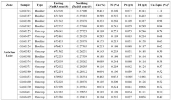 As data compilation continues, the copper equivalent percentage has been calculated with all results to standardize presentation and demonstrate copper correlation with nickel and PGEs. A table of the best grab samples from Anticline Lake zone is presented below with an updated map showing results in copper equivalent percentage, including nickel and PGEs. The results in copper equivalent further shows the continuous mineralization and the strong correlation between Cu and Ni-PGEs. Boulder samples listed in the table below were angular meter scale boulders located on large outcropping ridges and are believed to be close to bedrock source and or subcrop since they lay directly over the ultramafic intrusion and concordant electromagnetic anomalies. LINKED HERE is the prior Anticline Lake zone results.