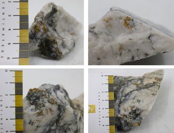 Figure 1. Photos of mineralization from KM-24-01-64 - ^Note that these photos are not intended to be representative of gold mineralization in KM-24-01-64 (CNW Group/New Found Gold Corp.)