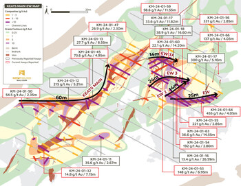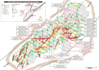 Figure 3. Keats Trench plan map with East-West and Keats Main veins simplified geology, Phase II and Phase I channel composite intervals and gold grade contours. (CNW Group/New Found Gold Corp.)
