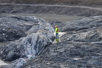 Technicians saw the channel along the cut line, producing two lines 5 cm apart and approximately 6-8 cm deep. The sample is removed from the bedrock and placed into sample bags. Individual sample bags are sealed and placed into totes, which are then sealed and marked with the contents.