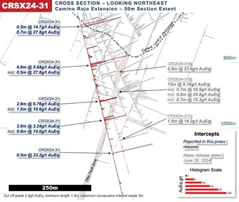 - 5.68 g/t AuEq over 4.9m, incl. 27.8 g/t AuEq over 0.5m (Hole CRSX24-31)