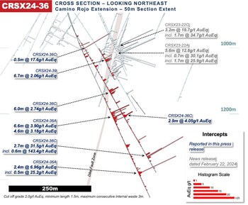 Figure 5: Camino Rojo Cross Section Drill Intersection Highlights for Fence CRSX24-36 (CNW Group/Orla Mining Ltd.)
