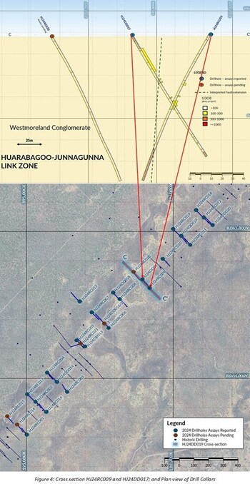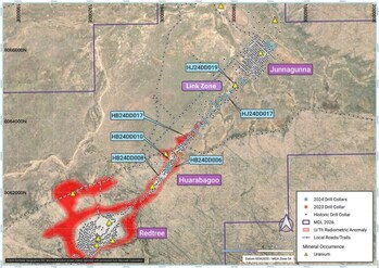 Drilling in the Huarabagoo-Junnagunna structural corridor is designed to test the mineralisation continuity between the two deposits with the intent to further increase the overall size of the resource. The program drill tested a system analogous to the Redtree Dyke system, and comprised of 21 RC holes for 3,096m, and 8 diamond drillholes for 1,124.10m, totaling 29 holes for 4,220.10m. The program was designed with three phases starting with an initial RC component (HJ24RC001 to HJ24RC013) to target the spatial extents for the Dolerite Dyke. The subsequent phases consisted of step out diamond drilling (HJ24DD014-HJ24DD021) to obtain structural measurements and establish structural controls and orientation of mineralisation the dolerite dyke system and fault zone extensions. The final phase consisted of RC drilling (HJ24RC014-HJ24RC021) to follow up on substantial downhole gamma results from earlier in the campaign.