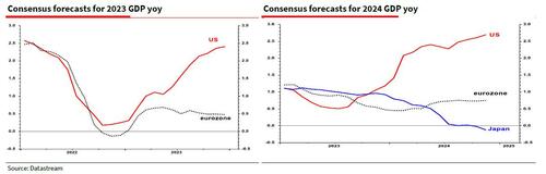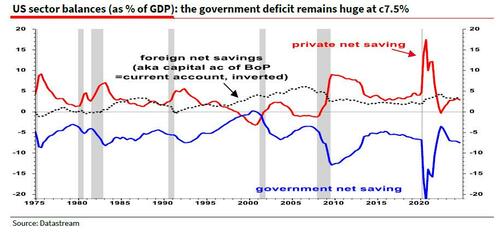 So while stock pickers might be seduced by the siren micro stories of the Magnificent 7 and more recently AI and ChatGPT to justify superior US profits, Edwards instead urges to look at the Kalecki-Levy equation and simply attribute the corporate profits boom to fiscal profligacy. Indeed, the US GDP upside surprises in both 2023 and this year have the same explanation, something we have pounded the table on for the past several years.