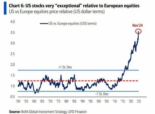 Picking up from that observation, Edwards pivots to a recent FT Opinion article this month titled The mother of all bubbles: The US has never been so overhyped, relative to the rest of the world, and which can be visualized in the following recent chart from BofA's Michael Hartnett showing US "exceptionalism" vs their European peers.