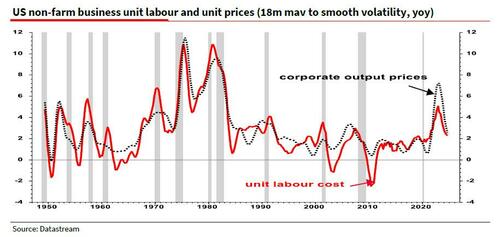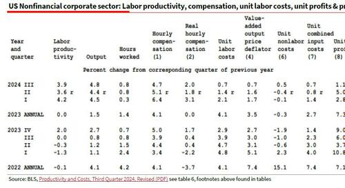 The chart above demonstrates the unusual recent "greedflation" phenomenon where corporate prices rose much faster than unit labour costs (ULC), and where the difference we now know was funded with excess debt. Despite the rapid wage growth, Albert notes that unit labor costs were held down by gangbusters productivity growth which rose this year at a stunning 4% yoy, causing unit profit margins to continue to expand even higher (see table below).