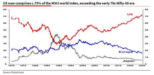 Starting at the top, the SocGen bear writes that there has been much commentary recently on the extent of the US stock market ‘bubble’, especially now the US equity market’s share of world market capitalization has hit an extraordinary 75% (more in Edwards' last GSW report, available to pro subs).