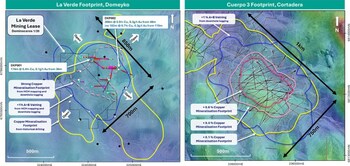 The La Verde footprint is comparable to the +1% A + B vein footprint at Cuerpo 3 (1,000m by 750m) at the Company's Cortadera porphyry copper-gold deposit, located 30km to the north (refer to Figure 3b). Cuerpo 3 is the largest of Cortadera's three porphyries, a cornerstone to Costa Fuego's Indicated mineral resource base of 798Mt grading 0.45% CuEq for 3.6Mt Cu and 3.0Moz Au1 and Inferred2 mineral resource of 203Mt grading 0.31% CuEq for 0.5Mt Cu and 0.4Moz Au.