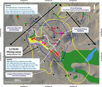 • First drill hole (DKP001) at La Verde intersects intercepts 174m grading 0.4% copper (Cu), 0.1g/t gold (Au) from 36m depth