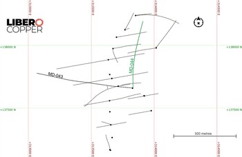 Figure 1. Plan view of the MD-044 hole and the location of the historical drilling at the Mocoa project. (CNW Group/Libero Copper & Gold Corporation)