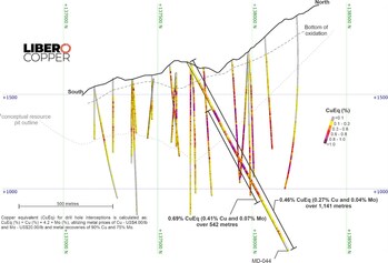 Figure 2. Vertical section along MD-044 looking West. Section influence of 100m. (CNW Group/Libero Copper & Gold Corporation)