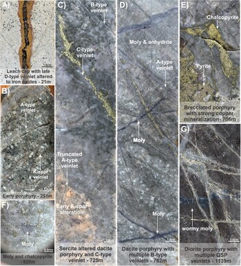 Throughout the hole, sericite alteration is pervasive and locally overprinted earlier potassic alteration, which is characterized by barren A-type (quartz veinlets) and K-spar veinlets (see figure 3B). Chalcopyrite and molybdenite (moly) are frequently associated with C-type (chalcopyrite dominant and minor content of pyrite) and classical B-type veins (moly and saccharoidal quartz), both of which cross-cut the earlier A-type and K-spar veinlets (see figure 3C and 3D). Additionally, fine-grained chalcopyrite and molybdenite crystals were observed disseminated within the groundmass of the dacite porphyry (see figure 3F) and as matrix-infill of a brecciated porphyry (see figure 3E). As an overall, three main magmatic-mineralization stages are recognized at the Mocoa porphyry Cu-Mo deposit: