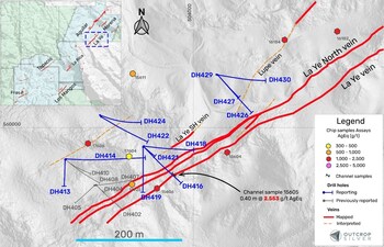 Figure 1. Plan view of La Ye vein target showing the drill holes reported in this release (Table 1), previous drilling, and samples previously reported (Table 2). For details on previous drill holes, see News Releases dated October 8, 2024 (https://outcropsilver.com/news/outcrop-silver-makes-a-discovery-at-la-ye-vein-in-santa-ana/) and November 19, 2024 (https://outcropsilver.com/news/outcrop-silver-continues-to-intercept-high-grade-silver-at-la-ye-discovery/). (CNW Group/Outcrop Silver & Gold Corporation)