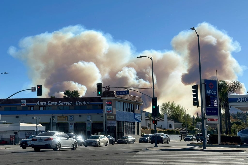 A plume of smoke from the Palisades Fire rises over Ventura Boulevard in the Woodland Hills section of Los Angeles on Friday. Photo: AP