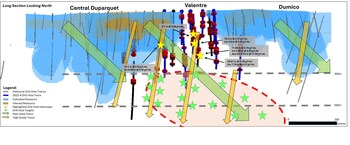 Figure 2: Representative long section through the Central Duparquet, Valentre, and Dumico targets, highlighting the multiple significant intercepts returned in 2023 and in the 2024 Phase 3 program, as well as upcoming drill hole targets aimed at unlocking exploration opportunities. (CNW Group/First Mining Gold Corp.)
