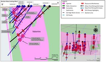 First Mining has identified two new discovery gold zones during the expansion drilling at the Valentre target. Assay results for the newly discovered "Miroir Zone", located north of the Valentre target, returned 3.12 g/t Au over 19.35 m, including 5.47 g/t Au over 9.6 m. Further drill results from the program identified a second discovery, the "Aiguille Zone", occurring south of the Valentre target, returning 8.99 g/t Au over 3.1 m. In total, 142* unique mineralized intercepts in 16 drill holes have been encountered in the Valentre expansion area, including the new discoveries at Miroir and Aiguille. These new drill results support a strong continuity in mineralization within the Central Duparquet, Valentre and Dumico ("CVD") area, while highlighting an affinity for additional discovery zones with increasing exploration at the Duparquet Project.