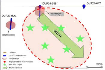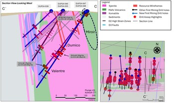 Figure 4: Valentre, Dumico Target and Miroir – Holes DUP24-039, DUP24-040, DUP24-047 and DUP24-048 are holes designed to target the potential mineralization continuity between Valentre and Dumico as well as at depth. Significant intercepts are highlighted downhole, with higher-grade zones identified along altered mineralized syenite units. These drill holes are also a test of mineralization continuity up and down-dip of previously reported DUP24-025. The cross section is looking west. (CNW Group/First Mining Gold Corp.)