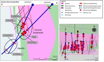 Figure 6: Central Duparquet Target and Aiguille – drill holes DUP24-041 and DUP24-044 are targeting the potential mineralization continuity between Central Duparquet and Valentre, and testing the mineralization along the southern contact of the syenite (Aiguille). These drill holes also test the higher-grade zone continuity at depth. Significant intercepts are highlighted downhole, with higher-grade zones identified along altered mineralized syenite units. The cross section is looking west. (CNW Group/First Mining Gold Corp.)