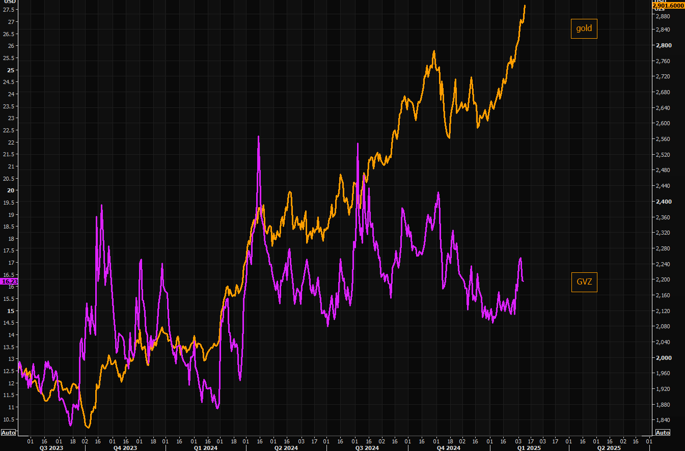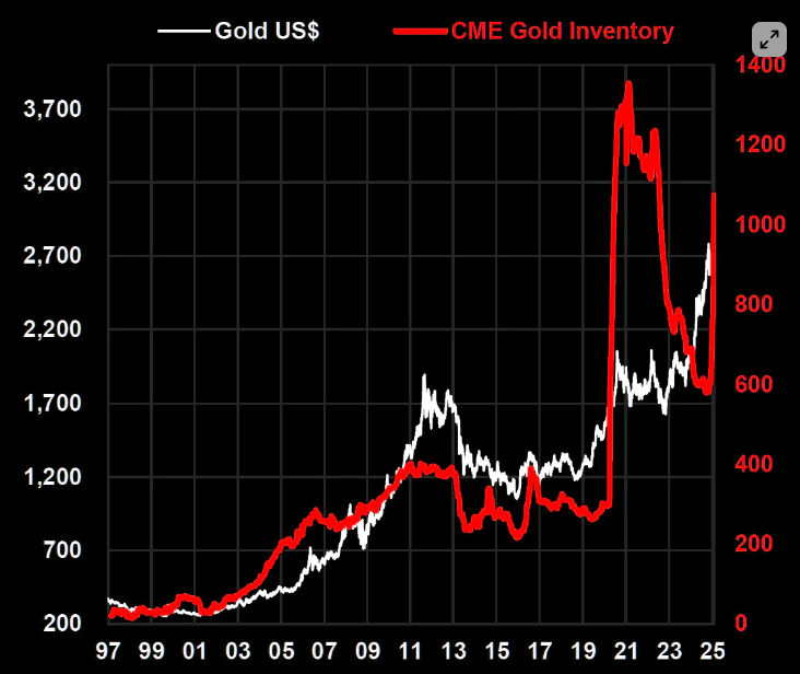 To: bull_dozer who wrote (211130 ) 2/10/2025 8:16:41 AM From: TobagoJack Respond to of 218105 >> THE F*CKING F*CKS... From behind paywall, gold rises, but as far as I can sense, not much fanfare, a puzzle In the meantime gold is still dirt What a strange idea, that the Trump should put a tariff on gold importzerohedge.com Gold Bros Winning: $3k Surge Incoming BY THE MARKET EAR MONDAY, FEB 10, 2025 - 20:30Gold - on the road to 3k Unstoppable gold continues surging today again. As we have been pointing out recently: gold is overbought, but there is room for it to move even higher before we reach the upper part of the channel (comes in around $3k). Source: Refinitiv When in doubt - use options We have been pointing out the call spreads logic in gold for some time. Part of the reasoning is the "upside skew" feature of gold. The other part of the logic is that people often tend to miss aggressive moves higher as they think "this has already gone too much". Playing these kind of setups via options is often attractive as you know the max money lay out, and do not need to be "afraid of heights". For the ones that played the call spreads logic, make sure to roll into higher strikes dynamically. Source: Refinitiv The golden tariff risk COMEX gold inventories spiking as the crowd is "front running" the risk of tariffs on physical gold imports by moving it from London to the USA. Source: Topdown charts The longer term view The central bank bid in gold is big...but could get much bigger. Source: Topdown charts Mine it Gold vs GDX gap trading with a very wide spread. Nothing new, but imagine GDX starts to play a proper catch up trade? Source: Refinitiv Valuation Relative gold bargain in miners... Source: Topdown charts Unloved Long gold miners is definitely not a popular trade... Source: Topdown charts