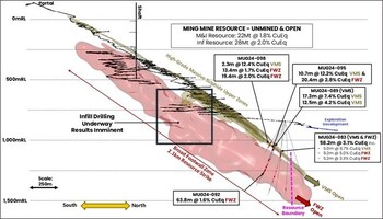 Drilling reported in this announcement confirms strong continuity of mineralisation at the Ming Mine. None of the reported results were incorporated into the Mineral Resource Estimate announced by the Company in the ASX announcement on 29 October 2024 (24.4Mt @ 1.9% CuEq in M&I and a further 34.5Mt @ 2% CuEq in the Inferred category).