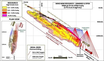 Drilling at the northern extent of the current Mineral Resource continues to show the development of a strong copper-rich footwall zone directly beneath the upper VMS lenses, resulting in a thick continuous zone of high-grade mineralisation (58.2m @ 3.1% CuEq ~true thickness in hole MUG24-083) This hole is directly along strike of previously reported intersections of 86.3m @ 3.7% CuEq and 76.3m @ 2.9% CuEq demonstrating continuity of the convergent zone.
