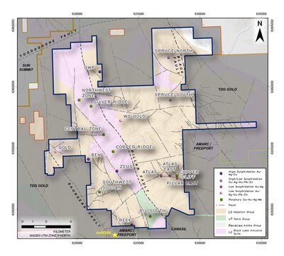 The Finlay team has been reviewing the geological data within the PIL & ATTY Properties and the surrounding areas including the AuRORA Au-Cu-Ag porphyry discovery on the JOY Project Joint Venture between Amarc Resources Ltd. ("Amarc") and Freeport-McMoRan Mineral Properties Canada Inc. ("Freeport"). The collar for drill hole JP24075 at the AuRORA discovery is only 730 meters ("m") south of the PIL Property boundary, which included a 266 m interval of 1.24 g/t Au, 0.31% Cu and 3.42 g/t Ag from 34.0 m (see Amarc Resources News Release dated January 20, 2025 on Amarc's SEDAR profile at www.sedarplus.ca). The Amarc-Freeport JOY Project is bound at its northwest and southeast extents by Finlay's PIL and ATTY properties.