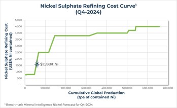 The Refinery's operating costs excluding byproduct credits ($1,598 /t nickel contained) would fall within the lowest decile of global production as per Benchmark Mineral Intelligence's ("Benchmark") nickel sulphate cost model, as presented in Figure 1. When byproduct credits are included, the Refinery would have a lower production cost that any current global producer.