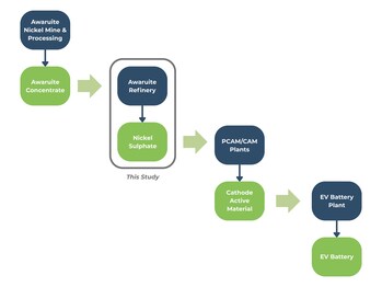 The mine-to-battery pathway for awaruite mineralization is presented in Figure 3. At a mine site, awaruite mineralization could be subjected to a simple mineral processing flowsheet to produce a high-grade awaruite concentrate, which could then be marketed either to the stainless steel or EV battery supply chains. This Study envisions purchasing of such awaruite concentrate and refining to battery-grade nickel sulphate, which would then be marketed to precursor cathode active material ("PCAM") and cathode active material ("CAM") producers to further process the nickel sulphate into CAM, a direct input in EV battery cell fabrication.