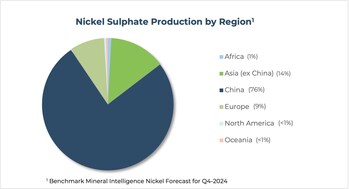 According to Benchmark's database, the 2024 annualized nickel sulphate production market size was approximately 657,000 tonnes per year of contained nickel as of the fourth quarter of 2024, with production heavily dominated by China at 76%, as presented in Figure 4. Additionally, less than 1% of current nickel sulphate production is North American (3,300 tonnes per year of contained nickel). As such, the 32,000 tonnes per year of high-quality nickel sulphate produced by the Refinery in Canada would represent an approximate tenfold increase in current North American nickel sulphate production.