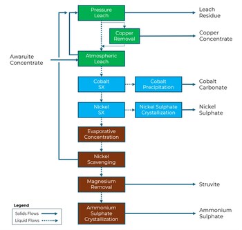 The metallurgical testwork program involved multiple bench- and a pilot-scale campaigns (see FPX news release dated October 15, 2024). The latest testwork campaign involved continuous pilot-scale testing of leaching unit operations and confirmed the leaching flowsheet. Nickel leach extractions greater than 99% and production of low-impurity leach solution, suitable for downstream purification and crystallization, were simultaneously achieved during piloting. In addition, bench-scale testing of solution purification and crystallization unit operations demonstrated the ability to produce battery-grade nickel sulphate crystals using the new ammonia-based flowsheet. Incorporating testwork results, the refining strategy takes advantage of awaruite's characteristics in a simple flowsheet utilizing well proven unit operations, as presented in Figure 5.