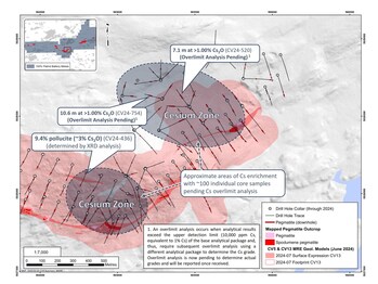 Overlimits (>1% Cs2O) are pending for cesium for more than 140 core samples from the 2024 summer-fall drill program, including approximately 100 from the CV13 Pegmatite. Overlimits are required when the analytical result exceeds the upper detection limit of the analytical package, which in this case is >10,000 ppm Cs (i.e., 1% Cs). Final cesium grade-width calculations for drill holes CV24-520, CV24-754, as well as multiple others, will be reported once overlimit analysis for cesium are received.